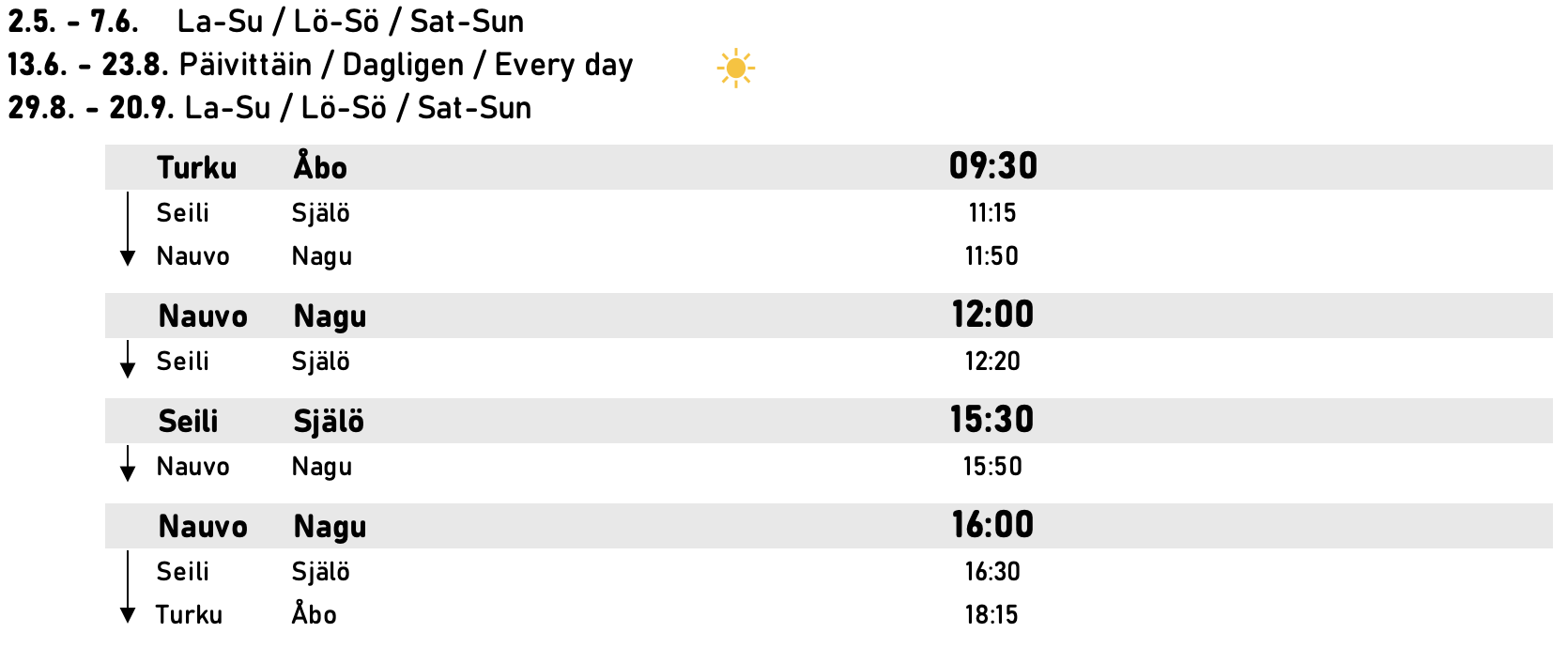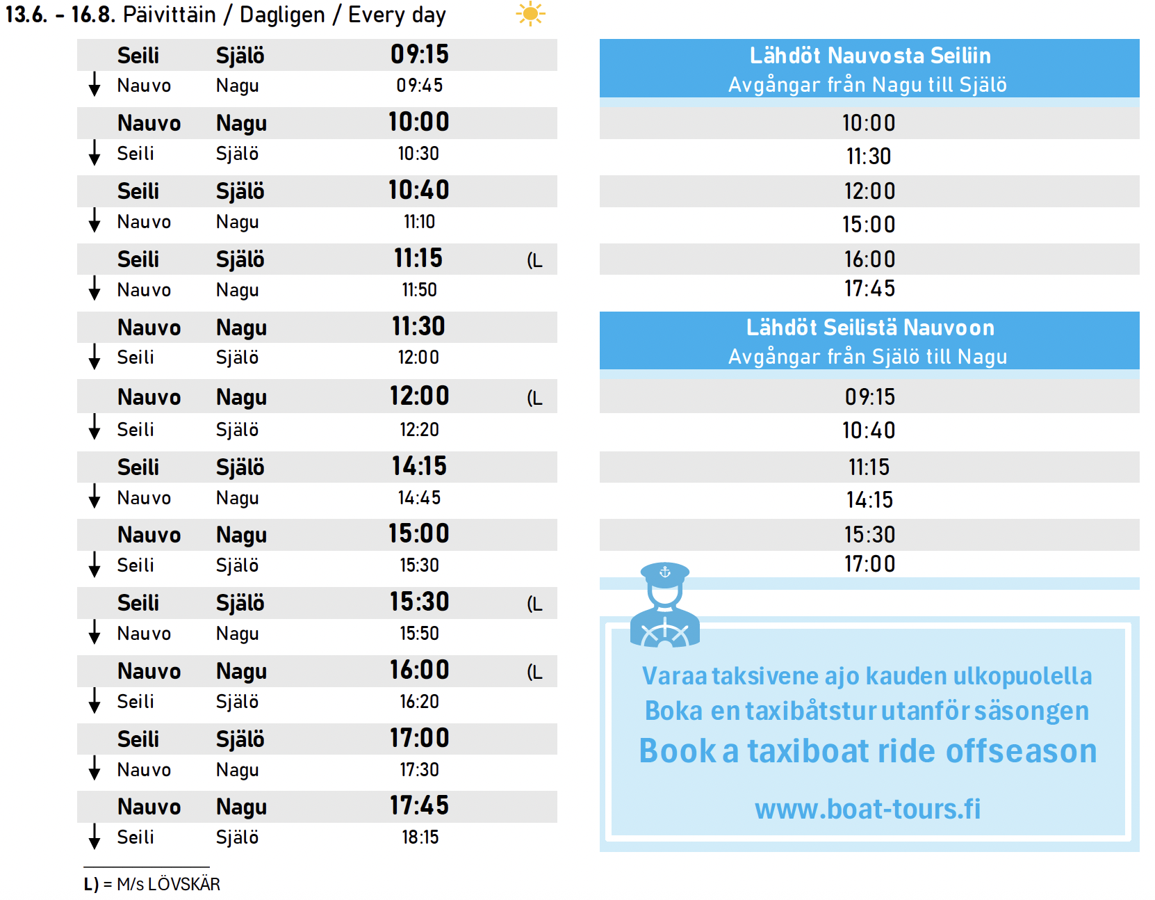 Archipelago Line’s M/s Lövskär operates on the route Turku–Seili–Nauvo from May to September. M/s Sommarskär operates on the Little Archipelago Trail´s route between Seili and Nauvo during the summer months. In addition to the regular schedule, charter trips are also offered at other times.