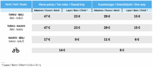 The Turku bus station is about 2 km from the pier. City bus 1 stops close to the pier, the stop is called ”Sairashuoneenpuisto”.