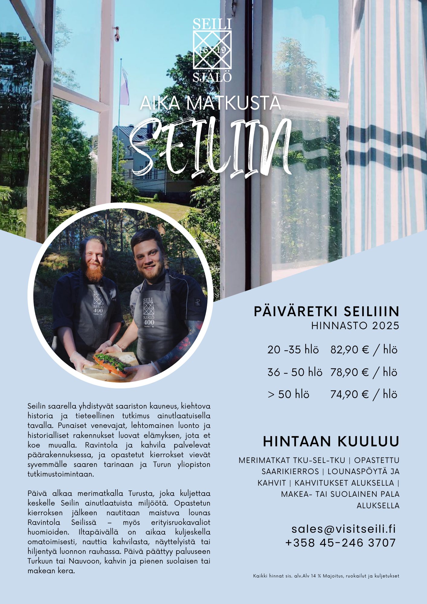 Lounaan jälkeen on vuorossa opastettu kierros, jonka aikana tutustutaan saaren ainutlaatuiseen luontoon ja tutkimustoimintaan. Oppaan johdolla syvennytään myös Seilin historiaan ja kerrotaan tarinoita satojen vuosien takaa.